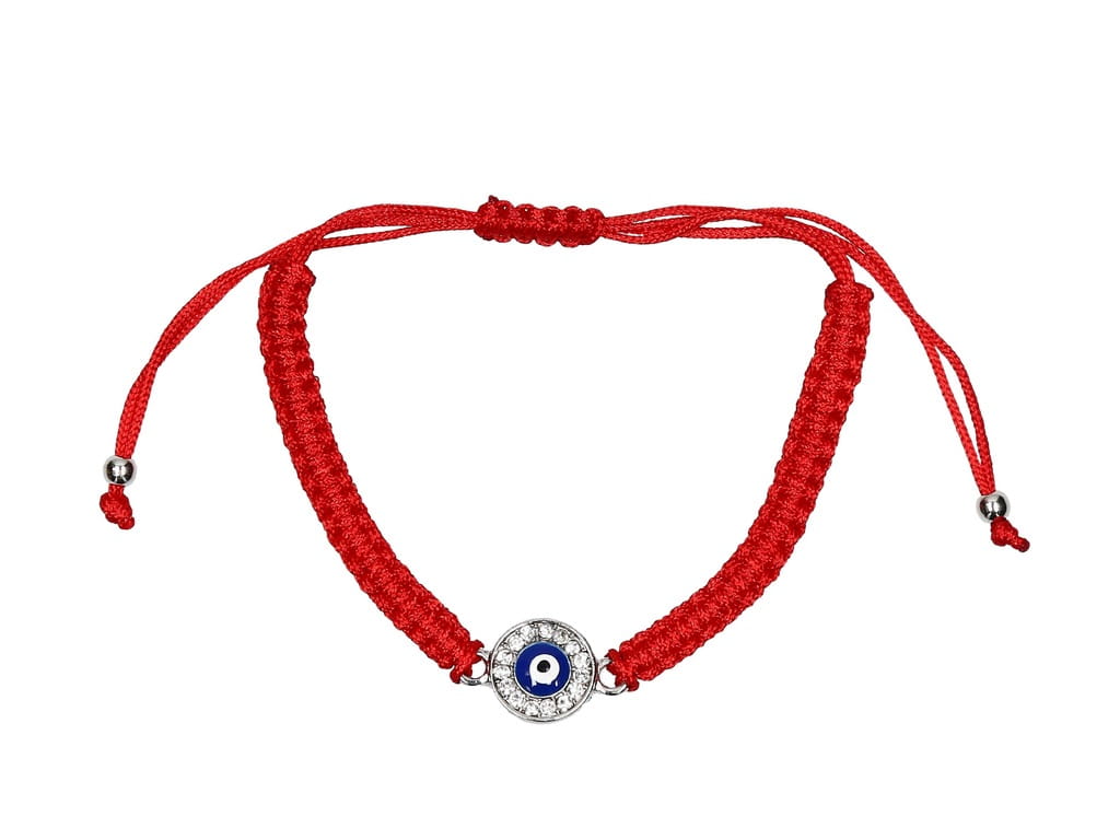 Przedmiotem aukcji jest czerwona bransoletka z okiem proroka i wykończeniem w kolorze srebrnym.