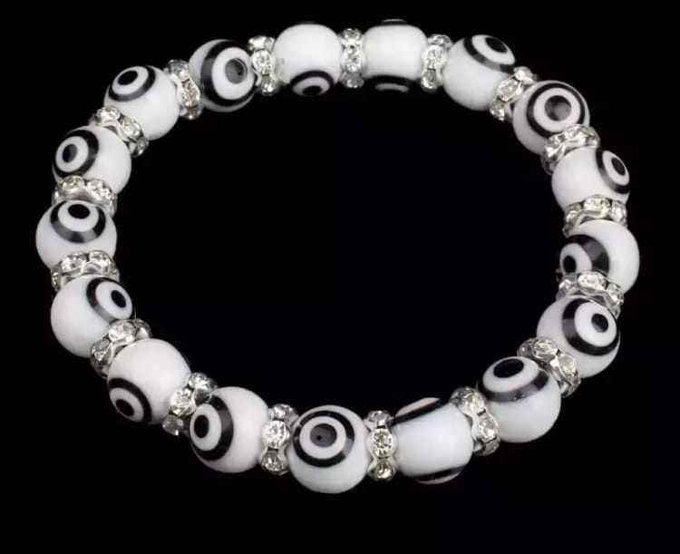 Przedmiotem aukcji jest doskonała na prezent, widoczna na zdjęciu turecka bransoletka z evil eye składająca się z koralików, rozciągana - na gumce. Pomiędzy koralikami znajdują się małe kamyczki przypominające cyrkonie. Oko proroka według tradycji chronić ma przed urokiem.