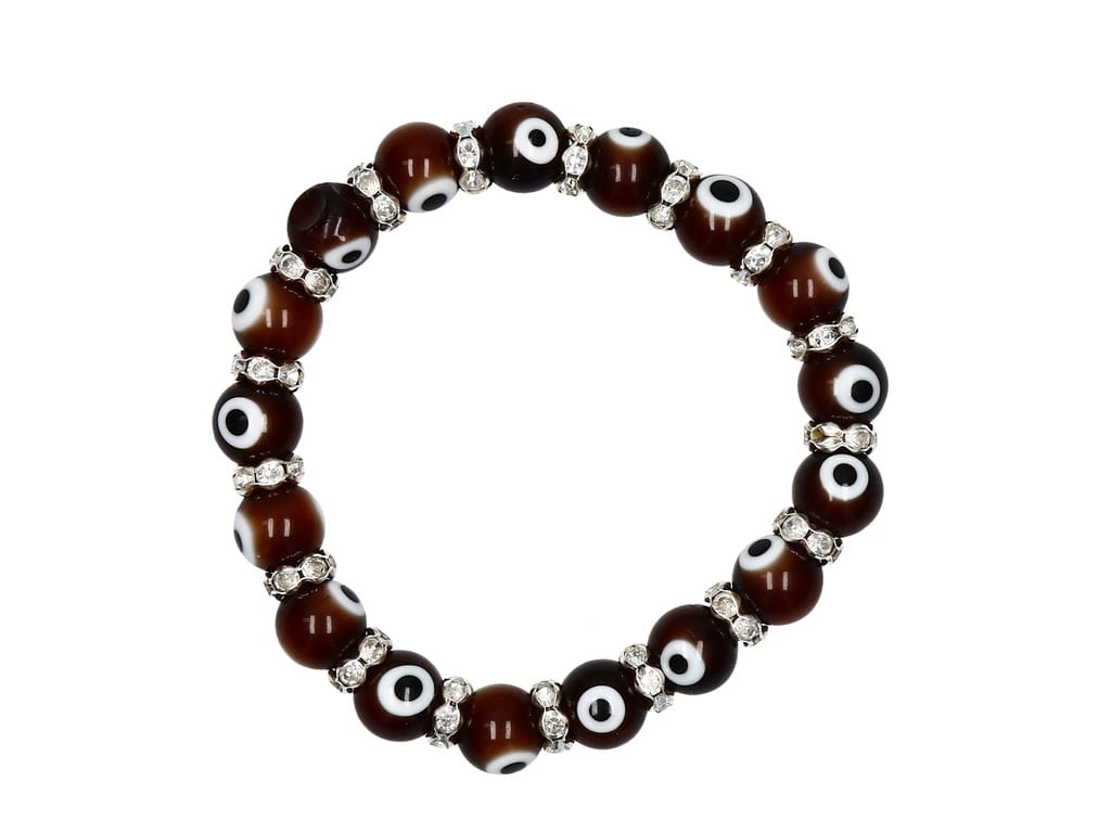 Przedmiotem aukcji jest doskonała na prezent, widoczna na zdjęciu turecka bransoletka z evil eye składająca się z brązowych koralików, rozciągana - na gumce. Pomiędzy koralikami znajdują się małe kamyczki przypominające cyrkonie. Oko proroka według tradycji chronić ma przed urokiem oraz złym i zazdrosnym spojrzeniem.