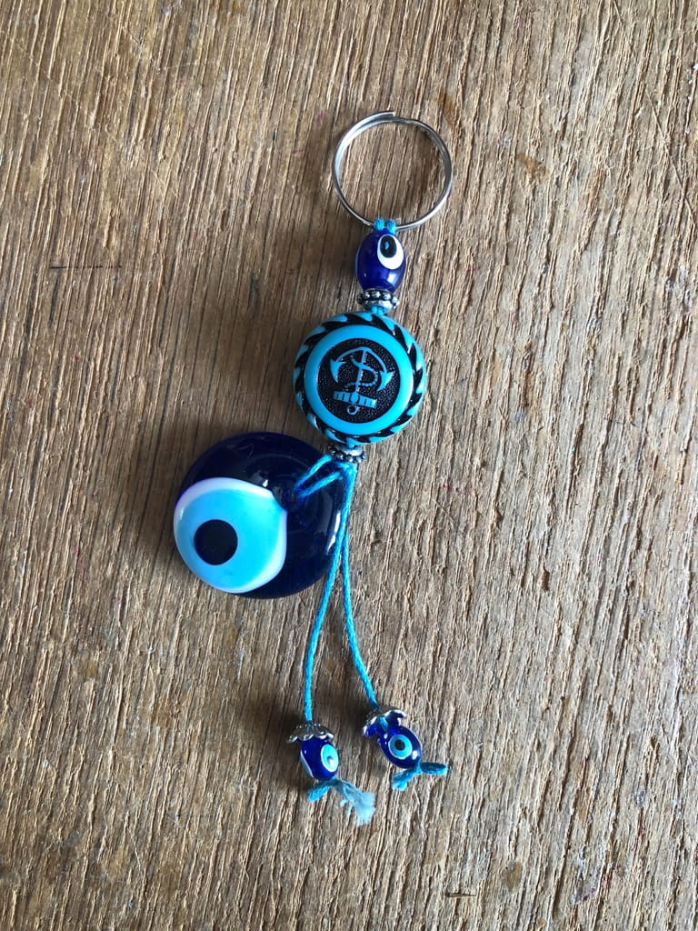 Doskonały na prezent elegancki turkusowy breloczek szklany. Ozdobiony okiem proroka (co widoczne jest na zdjęciu), według tureckiej tradycji ludowej chronić ma przed złym i zazdrosnym spojrzeniem nieprzychylnych nam osób. Można przypiąć go do kluczy lub jako ozdobny dodatek w dowolne inne miejsce, np. do suwaka od torebki.