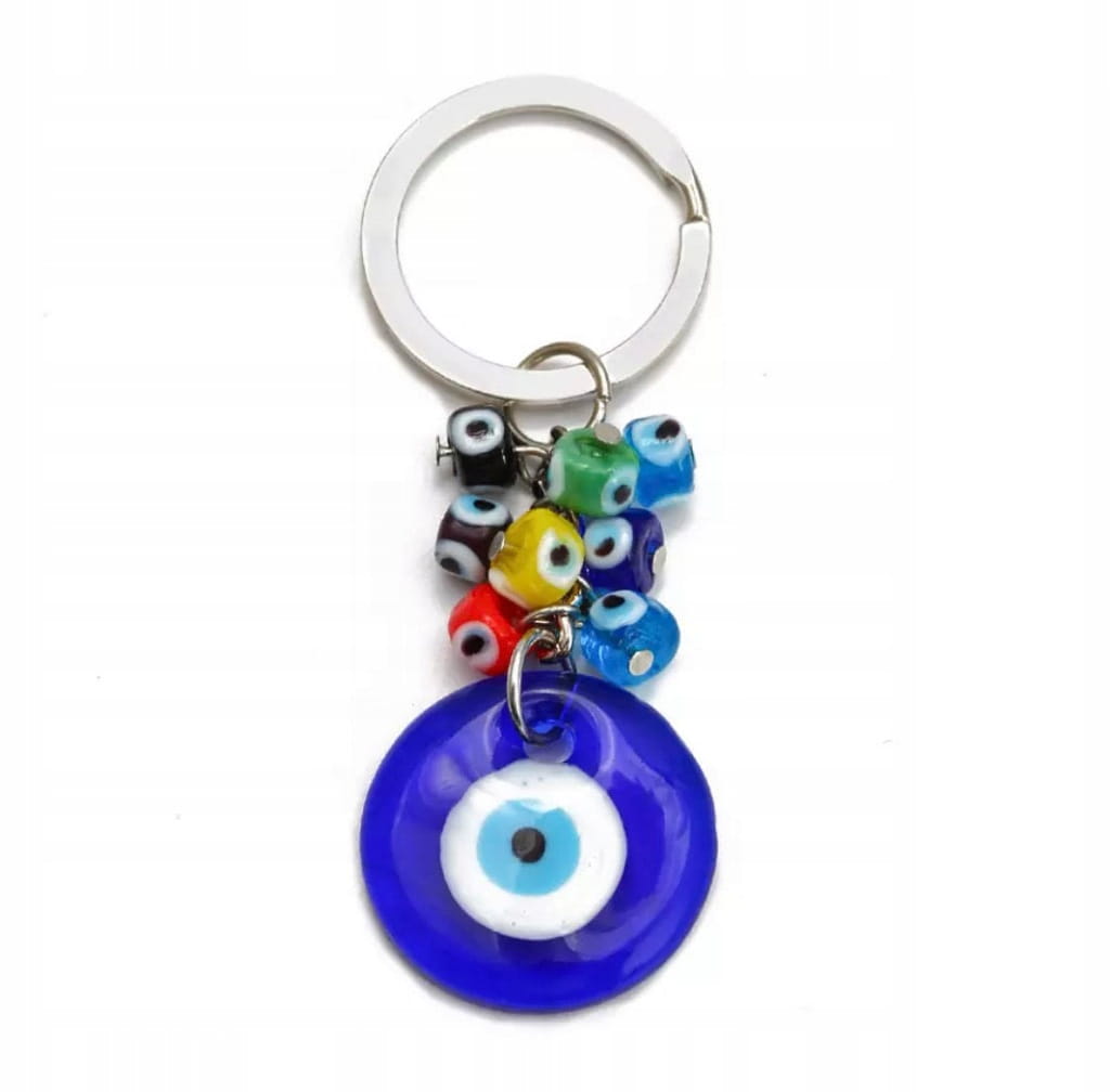 Doskonały na prezent elegancki turkusowy breloczek szklany. Ozdobiony okiem proroka (co widoczne jest na zdjęciu), według tureckiej tradycji ludowej chronić ma przed złym i zazdrosnym spojrzeniem nieprzychylnych nam osób. Można przypiąć go do kluczy lub jako ozdobny dodatek w dowolne inne miejsce, np. do suwaka od torebki.