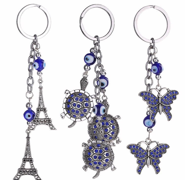 Przedmiotem aukcji jest doskonały na prezent elegancki srebrno-granatowy breloczek. Ozdobiony wieżami Eiffela oraz okiem proroka (co widoczne jest na zdjęciu), według tureckiej tradycji ludowej chronić ma przed złym i zazdrosnym spojrzeniem nieprzychylnych nam osób. Można przypiąć go do kluczy lub jako ozdobny dodatek w dowolne inne miejsce, np. do suwaka od torebki.