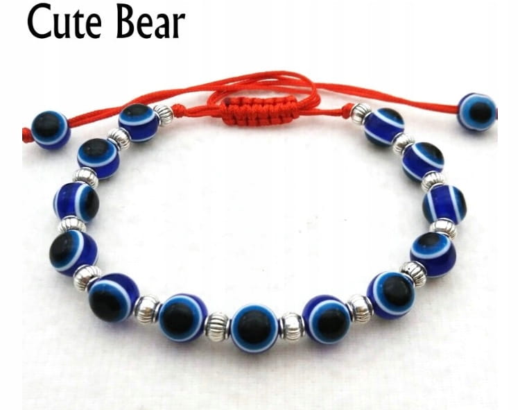 Doskonała na prezent, widoczna na zdjęciu czerwona turecka bransoletka na czerwonym sznurku z okiem proroka (evil eye). Oko proroka według tradycji chronić ma przed urokiem oraz złym i zazdrosnym spojrzeniem. Bransoletka jest regulowana i wykończona pozłacanymi elementami.