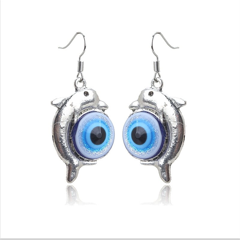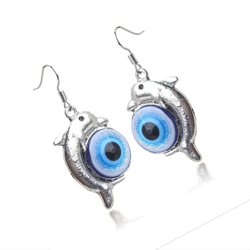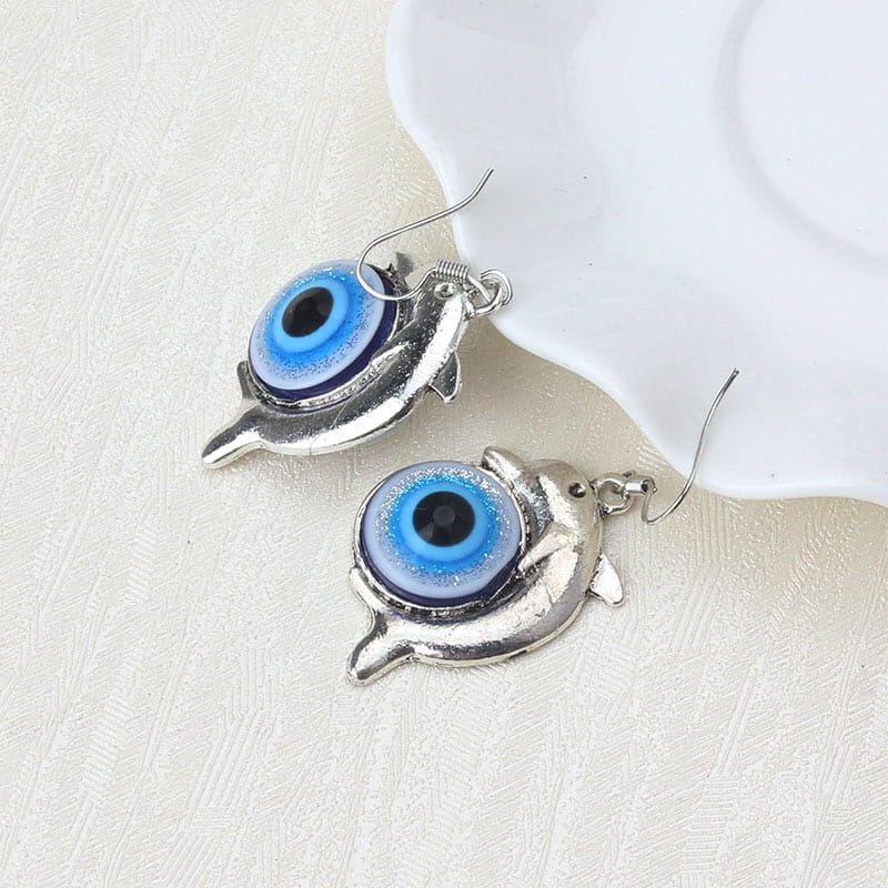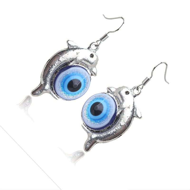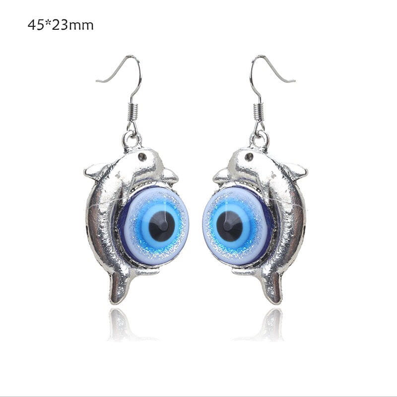 Przedmiotem aukcji są doskonałe na prezent, widoczne na zdjęciu damskie wiszące kolczyki w kolorze srebrnym z granatowym okiem proroka.