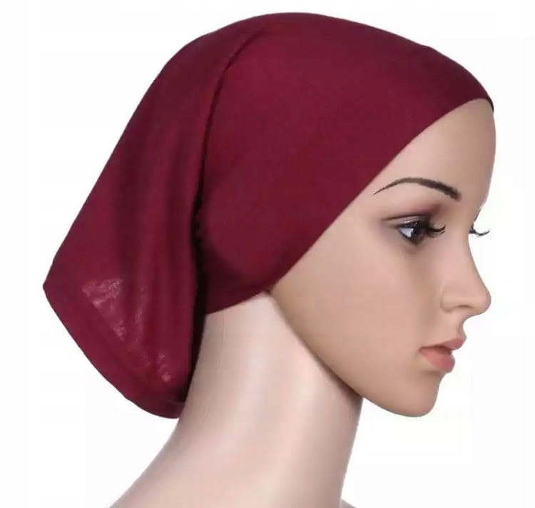 Doskonały na prezent, widoczny na zdjęciu wkład pod chustkę na głowę dla muzułmanki w kolorze bordowo-brązowym służący do przytrzymywania włosów.