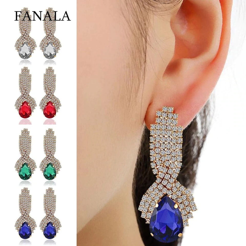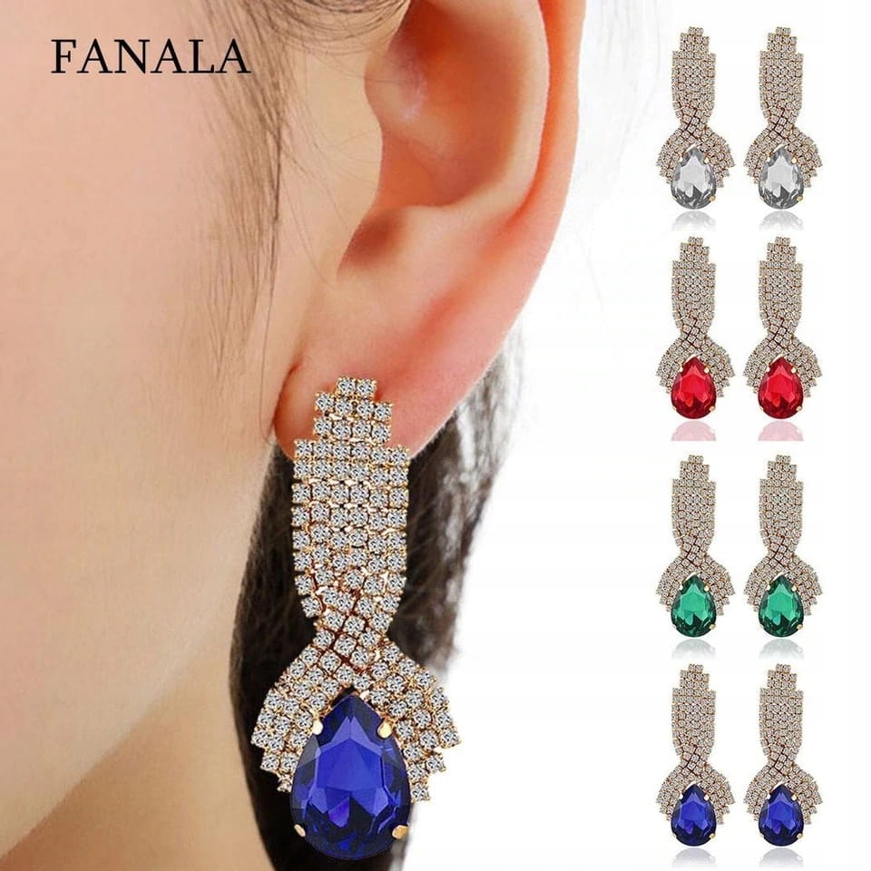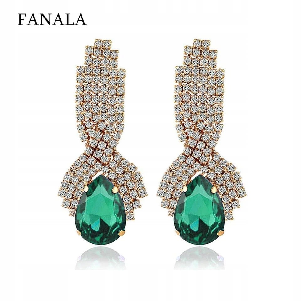 Doskonałe na prezent, widoczne na zdjęciu olśniewające damskie kolczyki z kamieniami przypominającymi cyrkonie. Wiszące kolczyki zapinane są na sztyft. Doskonałe na wieczorowe wyjścia, świetnie dopasują się do eleganckiego stroju.