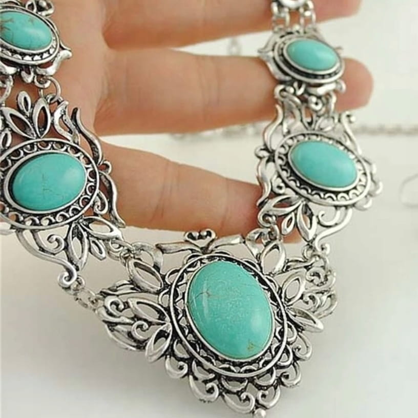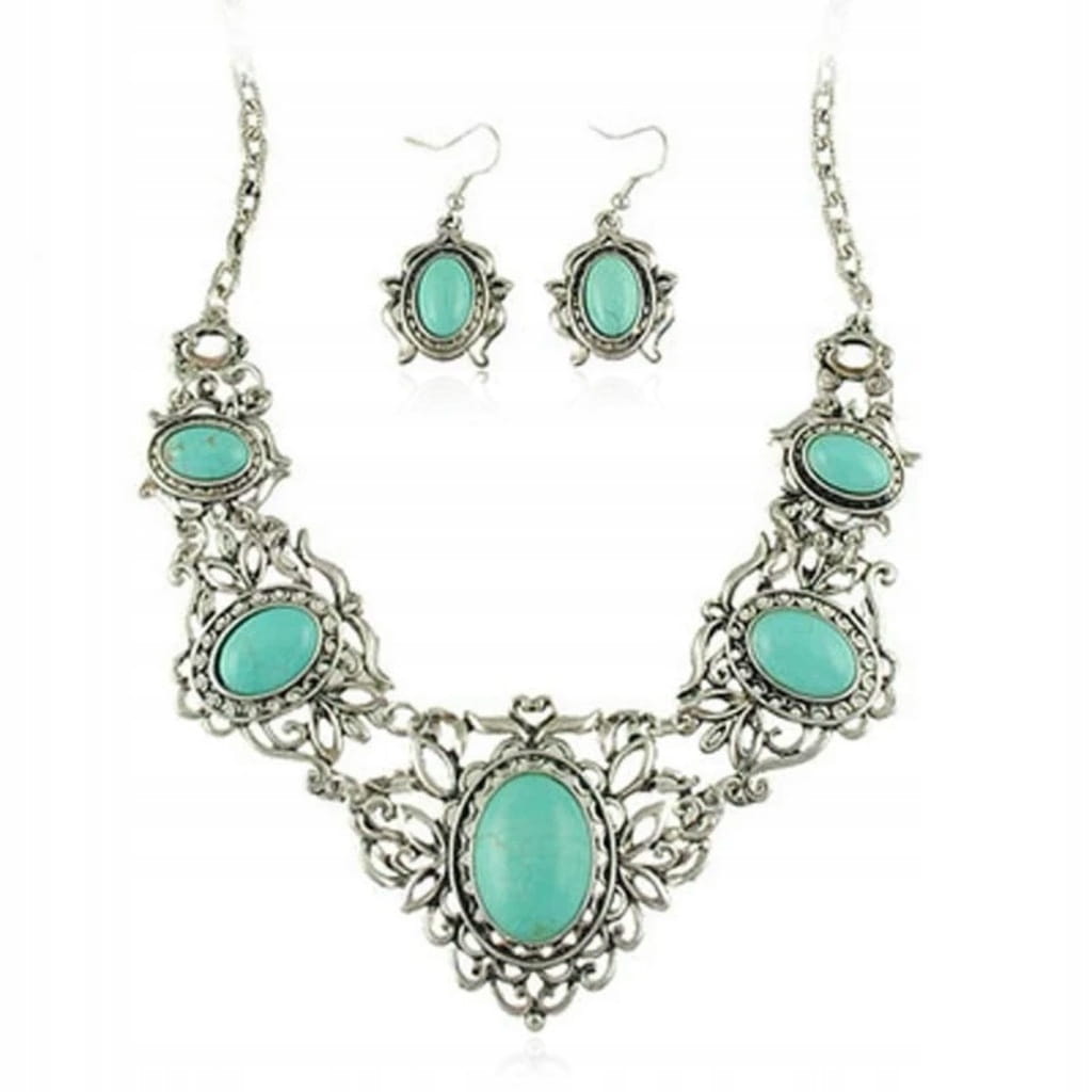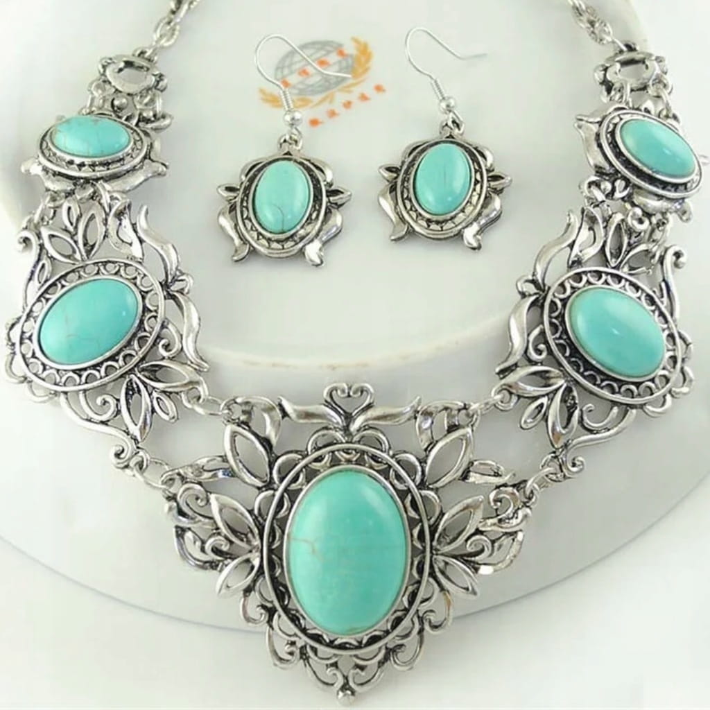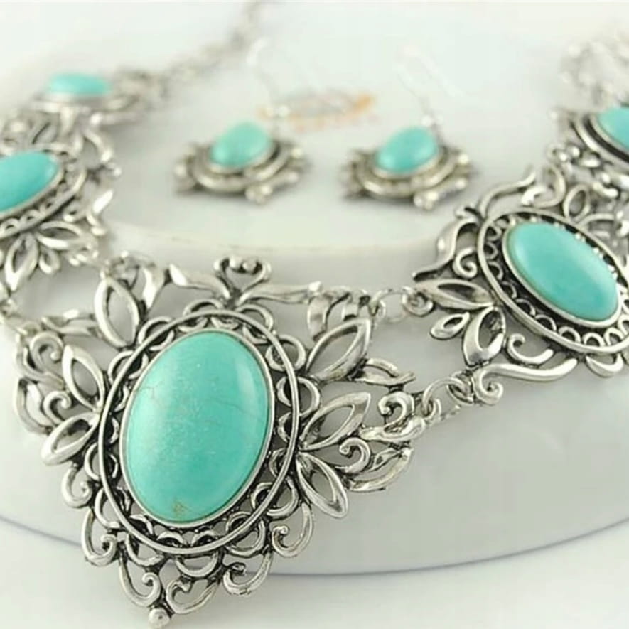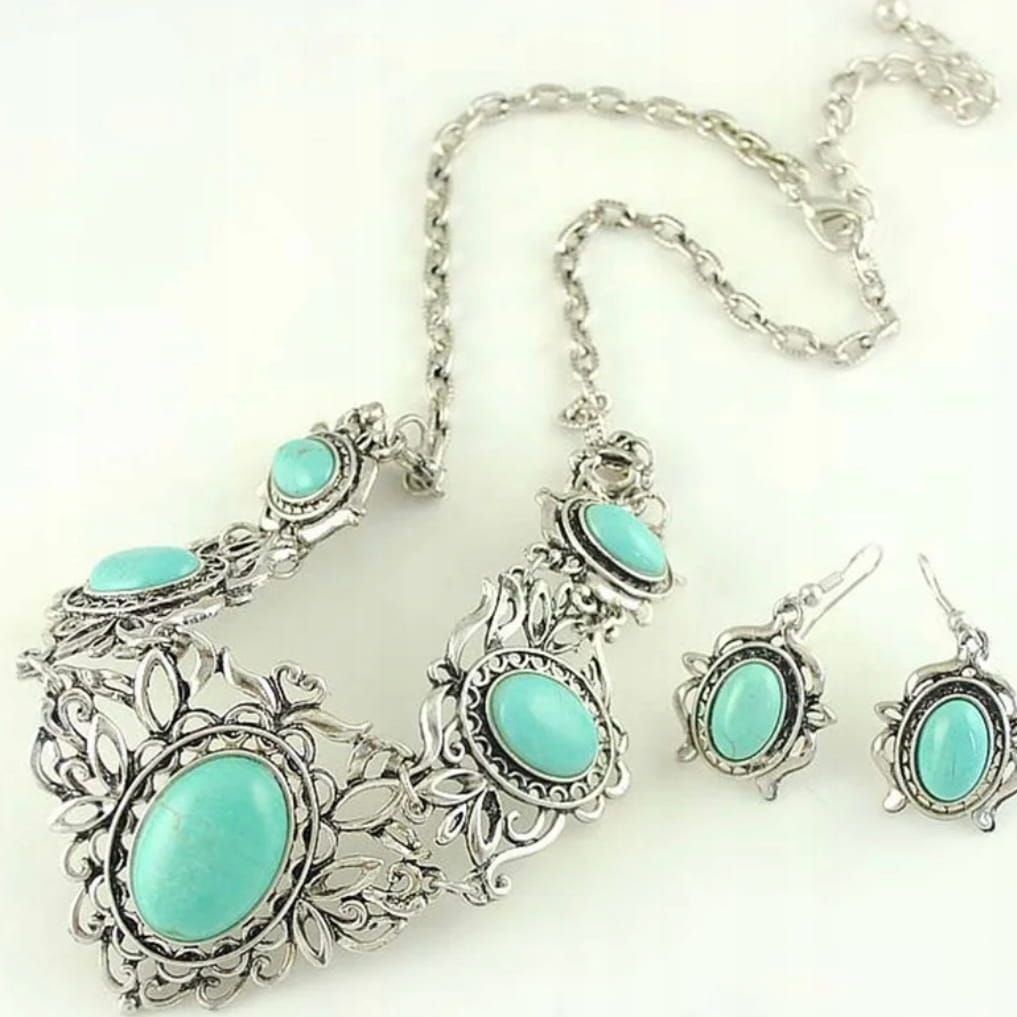 ✅ Zestaw tureckiej biżuterii w srebrnym kolorze oczkami imitującymi turkusy.