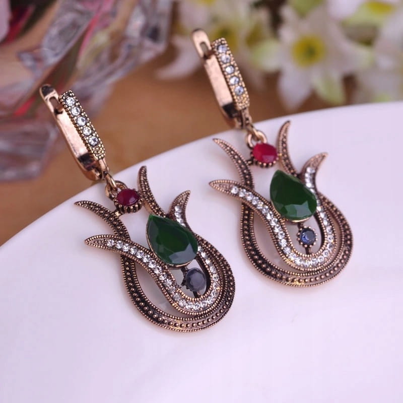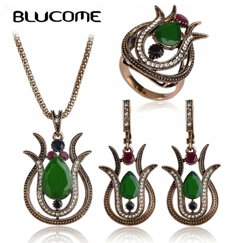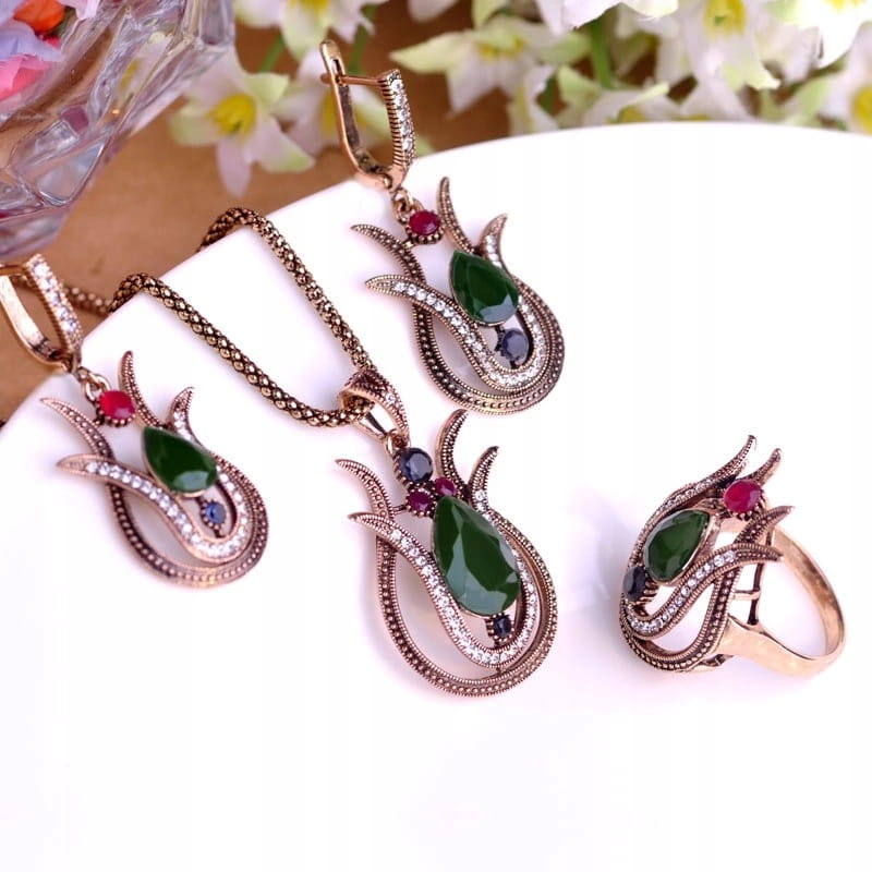 ✅ Zestaw tureckiej biżuterii w złotym kolorze z zielonymi kamyczkami.