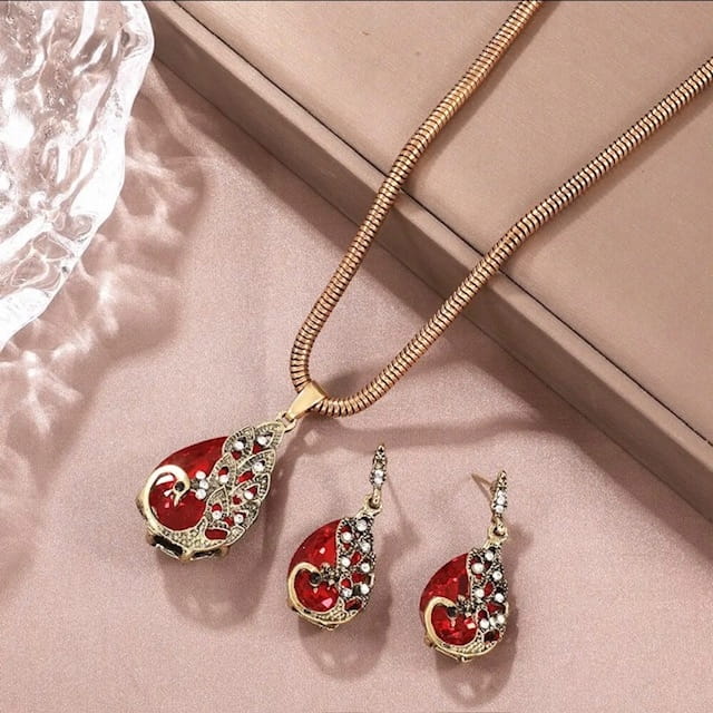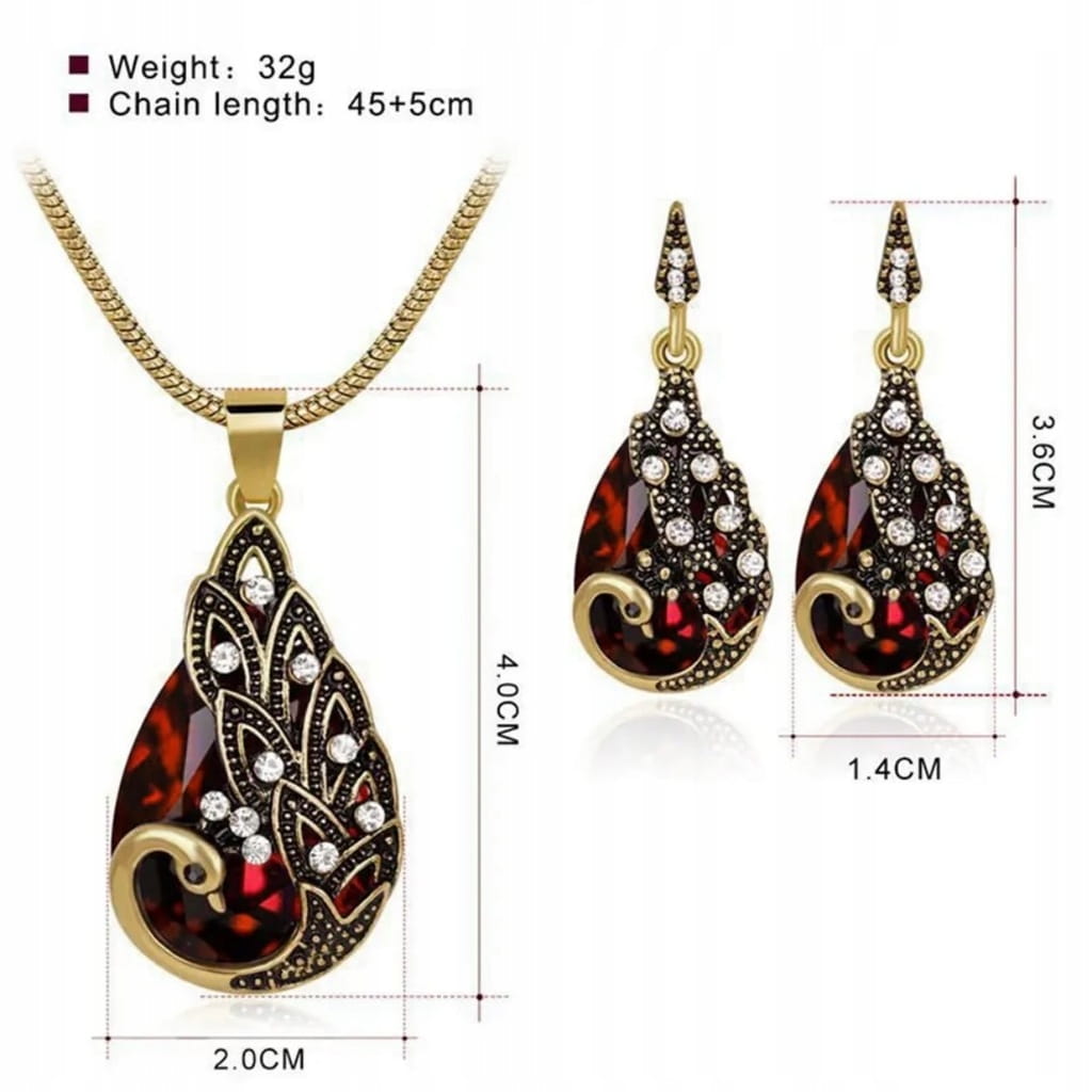 ✅ Zestaw tureckiej biżuterii w złotym kolorze. z czerwonymi oczkami i kształtem pawia.