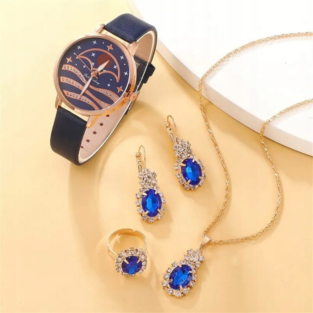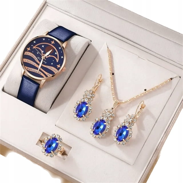 ✅W skład zestawu wchodzi zegarek, łańcuszek z zawieszką, wiszące kolczyki oraz pierścionek.