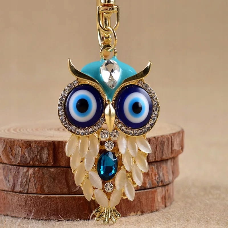 Przedmiotem aukcji jest doskonały na prezent elegancki breloczek sowa. Ozdobiony okiem proroka (co widoczne jest na zdjęciu), według tureckiej tradycji ludowej chronić ma przed złym i zazdrosnym spojrzeniem nieprzychylnych nam osób. Można przypiąć go do kluczy lub jako ozdobny dodatek w dowolne inne miejsce, np. do suwaka od torebki. Posiada karabińczyk.