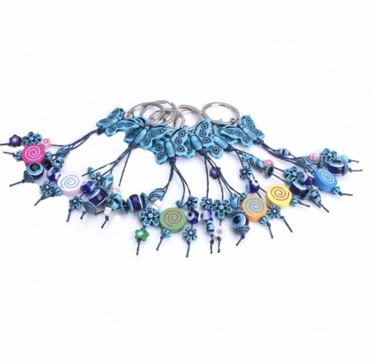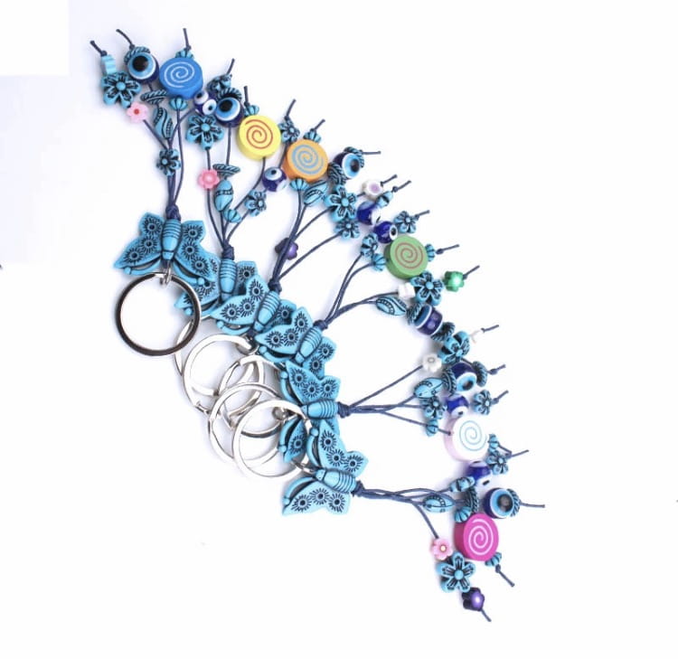 Przedmiotem aukcji jest doskonały na prezent elegancki turkusowy breloczek. Ozdobiony motylkiem oraz okiem proroka (co widoczne jest na zdjęciu), według tureckiej tradycji ludowej chronić ma przed złym i zazdrosnym spojrzeniem nieprzychylnych nam osób. Można przypiąć go do kluczy lub jako ozdobny dodatek w dowolne inne miejsce, np. do suwaka od torebki.