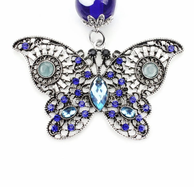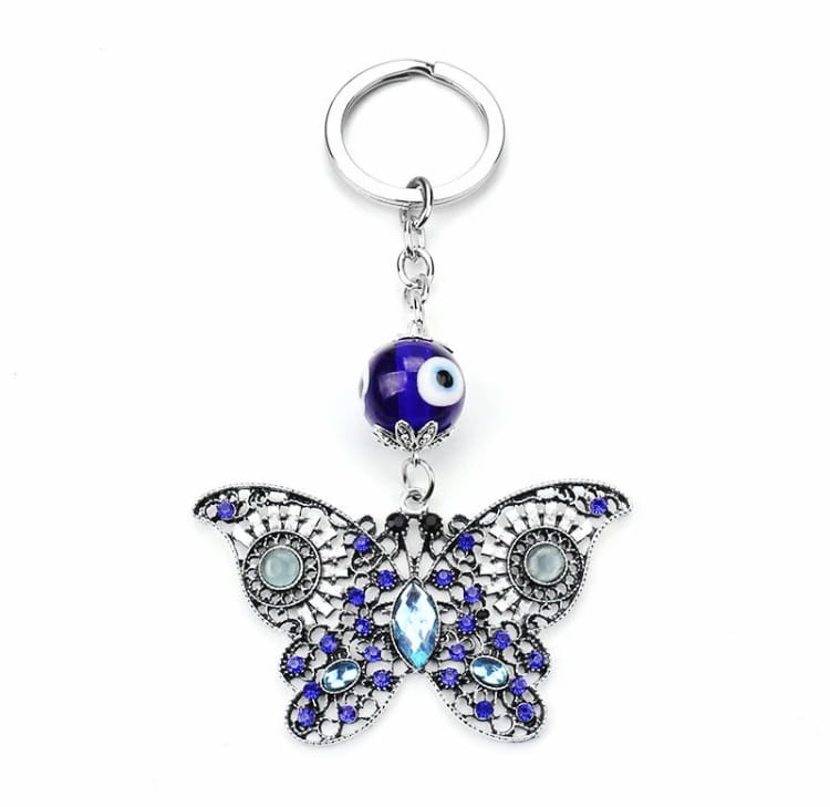 Przedmiotem aukcji jest doskonały na prezent elegancki breloczek motyl z ozdobnymi kamykami w kolorze granatowym i jasnozielonym. Ozdobiony okiem proroka (co widoczne jest na zdjęciu), według tureckiej tradycji ludowej chronić ma przed złym i zazdrosnym spojrzeniem nieprzychylnych nam osób. Można przypiąć go do kluczy lub jako ozdobny dodatek w dowolne inne miejsce, np. do suwaka od torebki.