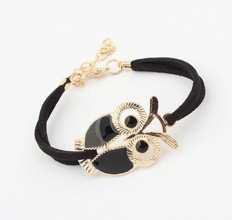 Przedmiotem aukcji jest doskonała na prezent, widoczna na zdjęciu bransoletka z sową na rzemyku, wykańczana pozłacanymi elementami.