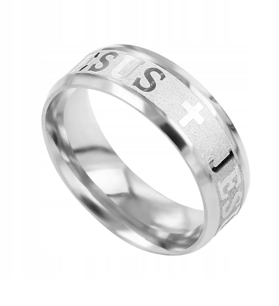 ✅Elegancka posrebrzana obrączka z napisem Jezus.