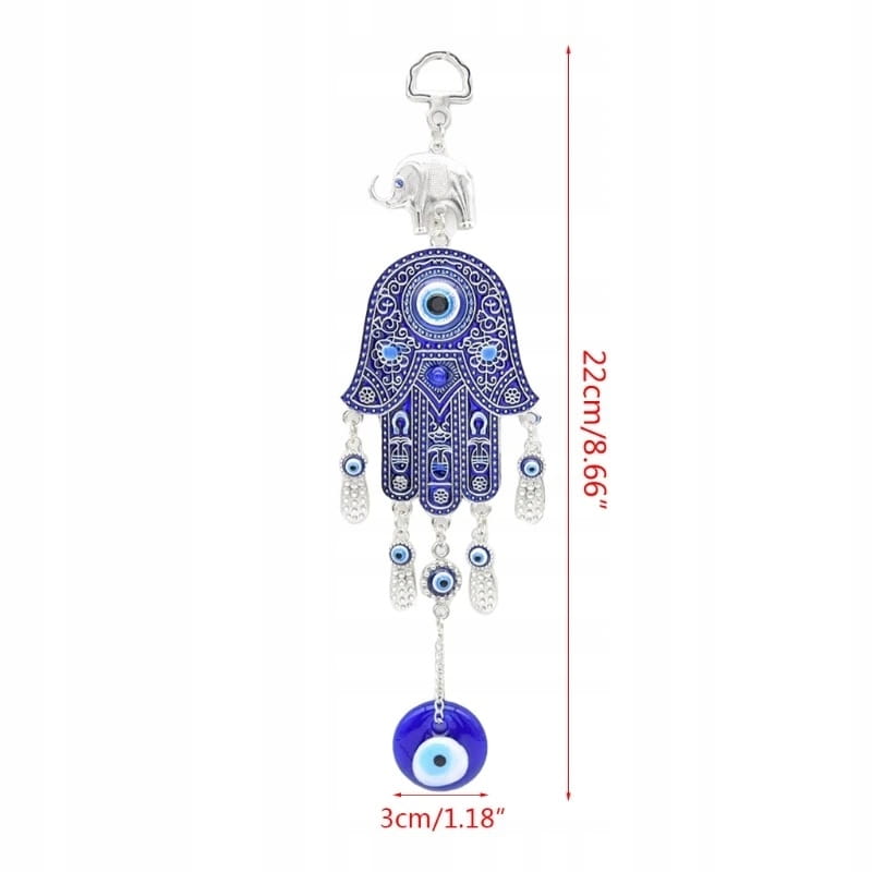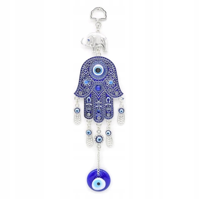 Doskonała na prezent wisząca ozdoba z ręką fatimy. Według tureckiej tradycji ludowej chronić ma przed złym i zazdrosnym spojrzeniem nieprzychylnych nam osób. Można zawiesić ją w dowolnym miejscu, na przykład na lusterku w samochodzie lub na ścianie.