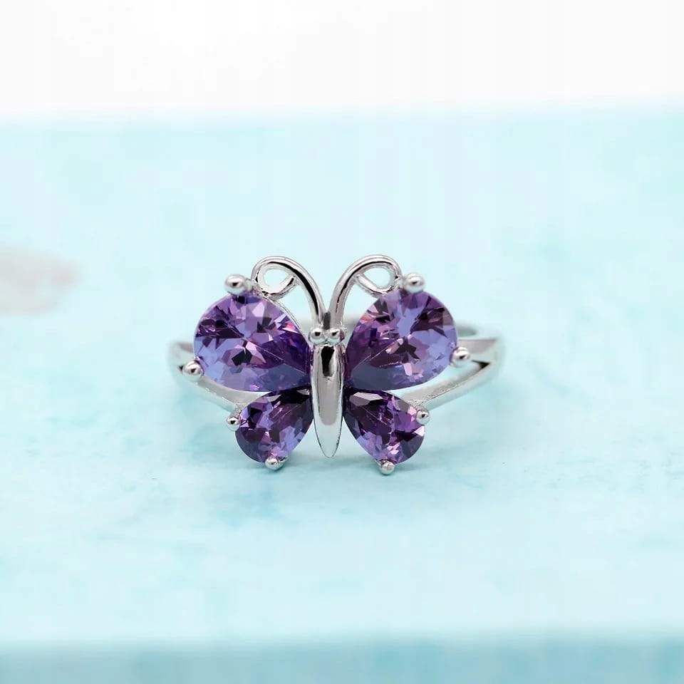 Przedmiotem aukcji jest doskonały na prezent, widoczny na zdjęciu elegancki pierścień damski z fioletowym motylkiem.