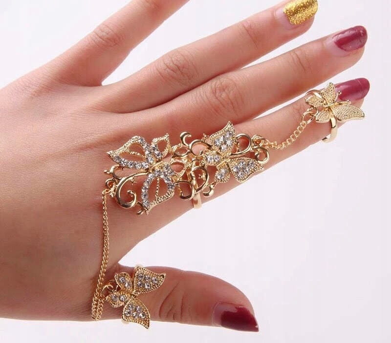 Przedmiotem aukcji jest doskonały na prezent damski pierścionek pozłacany, ozdobiony kamyczkami przypominającymi cyrkonie (co widoczne jest na zdjęciu).