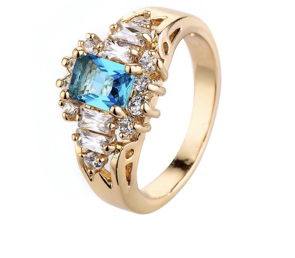 Przedmiotem aukcji jest doskonały na prezent, widoczny na zdjęciu elegancki pozłacany pierścień damski z błękintnym oczkiem i białymi kamyczkami przypominającymi cyrkonie. Pierścionek ma imitować pierścionki, które na planie serialu Wspaniałe Stulecie noszą sułtanki.