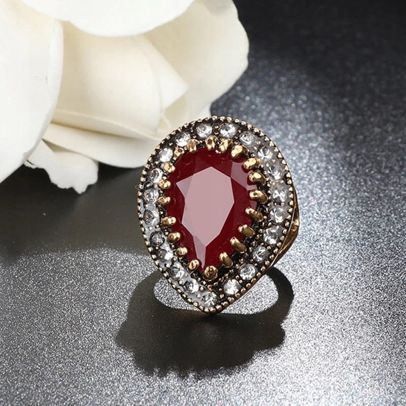Przedmiotem aukcji jest doskonały na prezent, widoczny na zdjęciu elegancki złoto-miedziany pierścień damski z bordowym kamieniem i białymi kamyczkami przypominającymi cyrkonie. Pierścionek ma imitować ten, który na planie serialu Wspaniałe Stulecie nosiła Roksolana, czyli Hürrem.