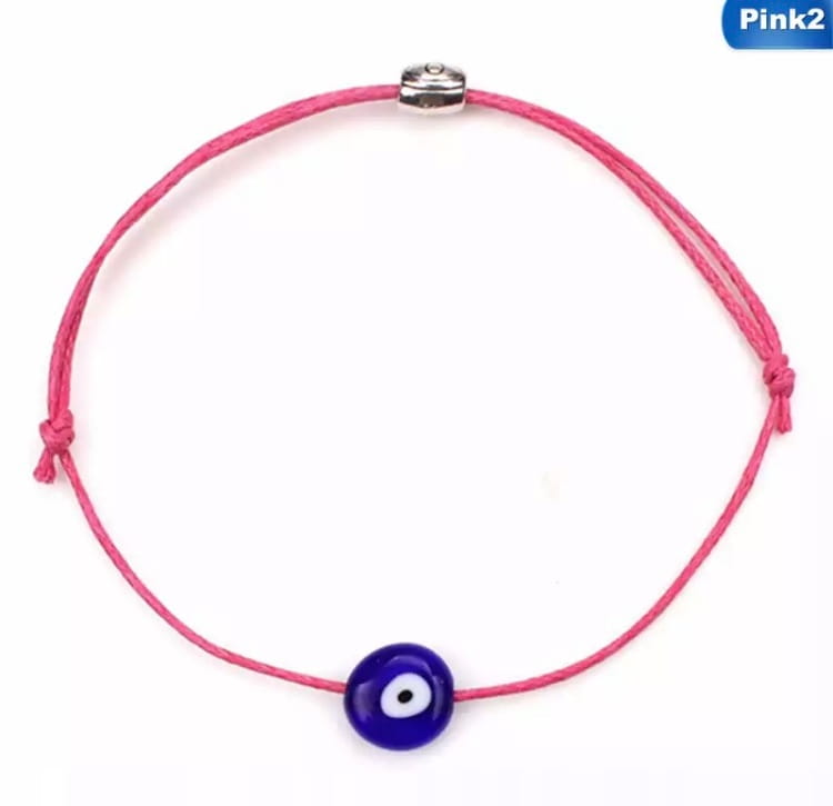 Przedmiotem aukcji jest różowa bransoletka z okiem proroka i wykończeniem w kolorze srebrnym.