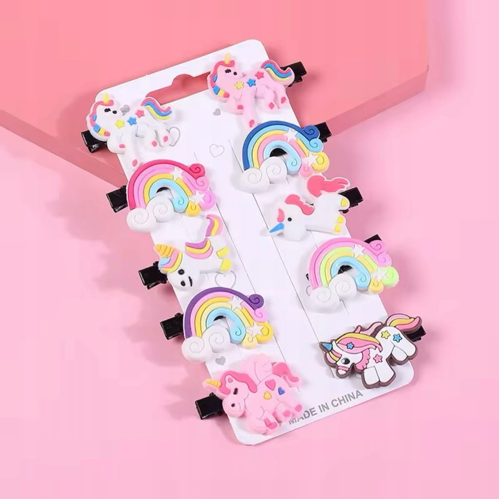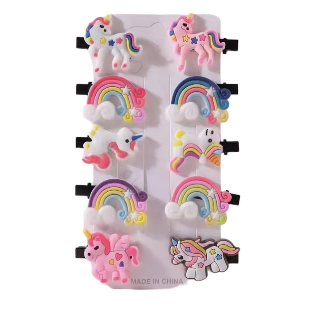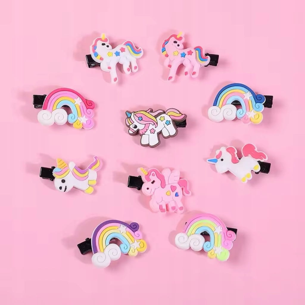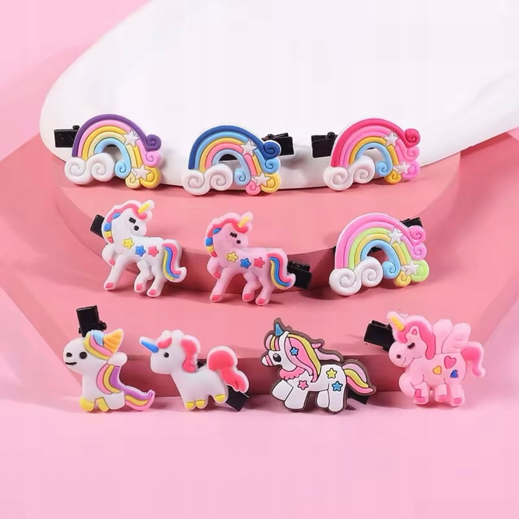 ✅ Zestaw 10 sztuk spinek do włosów w kształcie jednorożców i tęczy.
