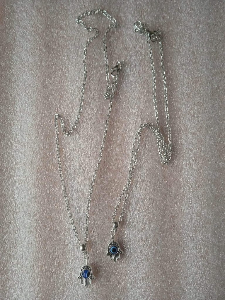 Przedmiotem aukcji jest doskonały na prezent, widoczny na zdjęciu łańcuszek z okiem proroka i hamsą. Oko proroka i hamsa według tradycji chronić mają przed urokiem oraz złym i zazdrosnym spojrzeniem. Zapinanie łańcuszka jest regulowane.
