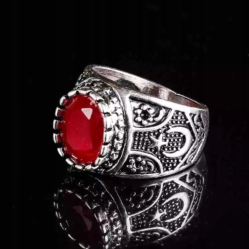 Turecki posrebrzany sygnet z czerwonym oczkiem