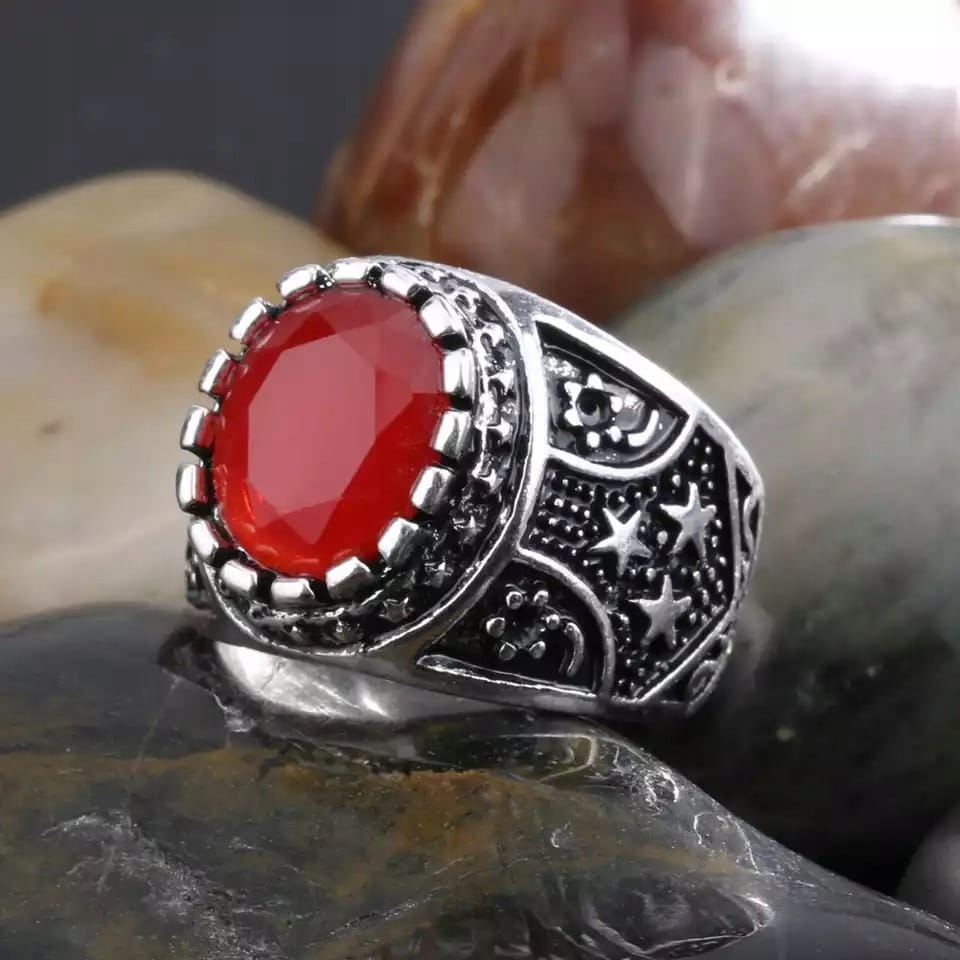 Turecki posrebrzany sygnet z czerwonym oczkiem