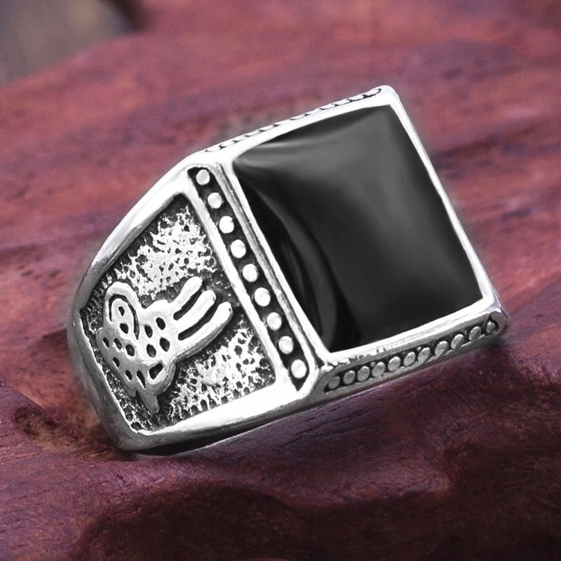 TURECKI POSREBRZANY SYGNET Z CZARNYM KAMIENIEM.