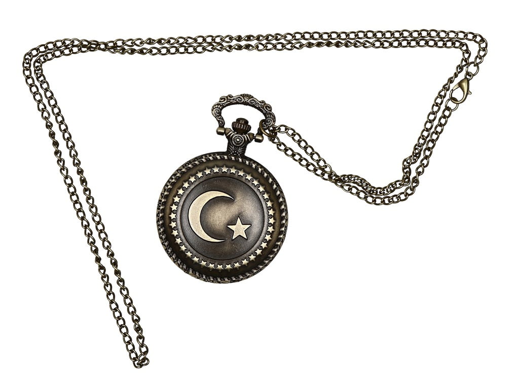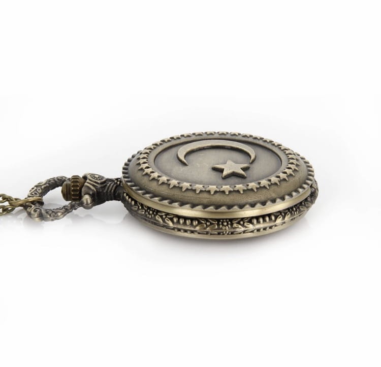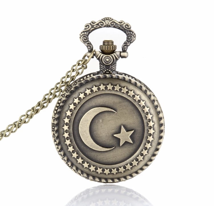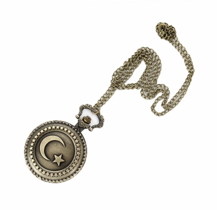 Przedmiotem aukcji jest doskonały na prezent elegancki zegarek na łańcuszku z symbolami znajdującymi się na tureckiej fladze: półksiężycem i gwiazdą.