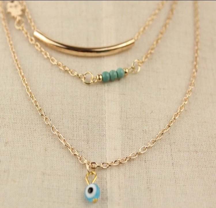 Przedmiotem aukcji jest doskonały na prezent, widoczny na zdjęciu trzywarstwowy turecki / arabski łańcuszek z granatowym (jak na pierwszej miniaturce) okiem proroka i hamsą w kolorze złotym. Naszyjnik posiada również dodatek w postaci trzech koralików w kolorze miętowym. Oko proroka i hamsa według tradycji chronić mają przed urokiem oraz złym i zazdrosnym spojrzeniem. Zapinanie łańcuszka jest regulowane. Całkowita długość najszerszego zewnętrznego łańcuszka to ok. 56 cm.